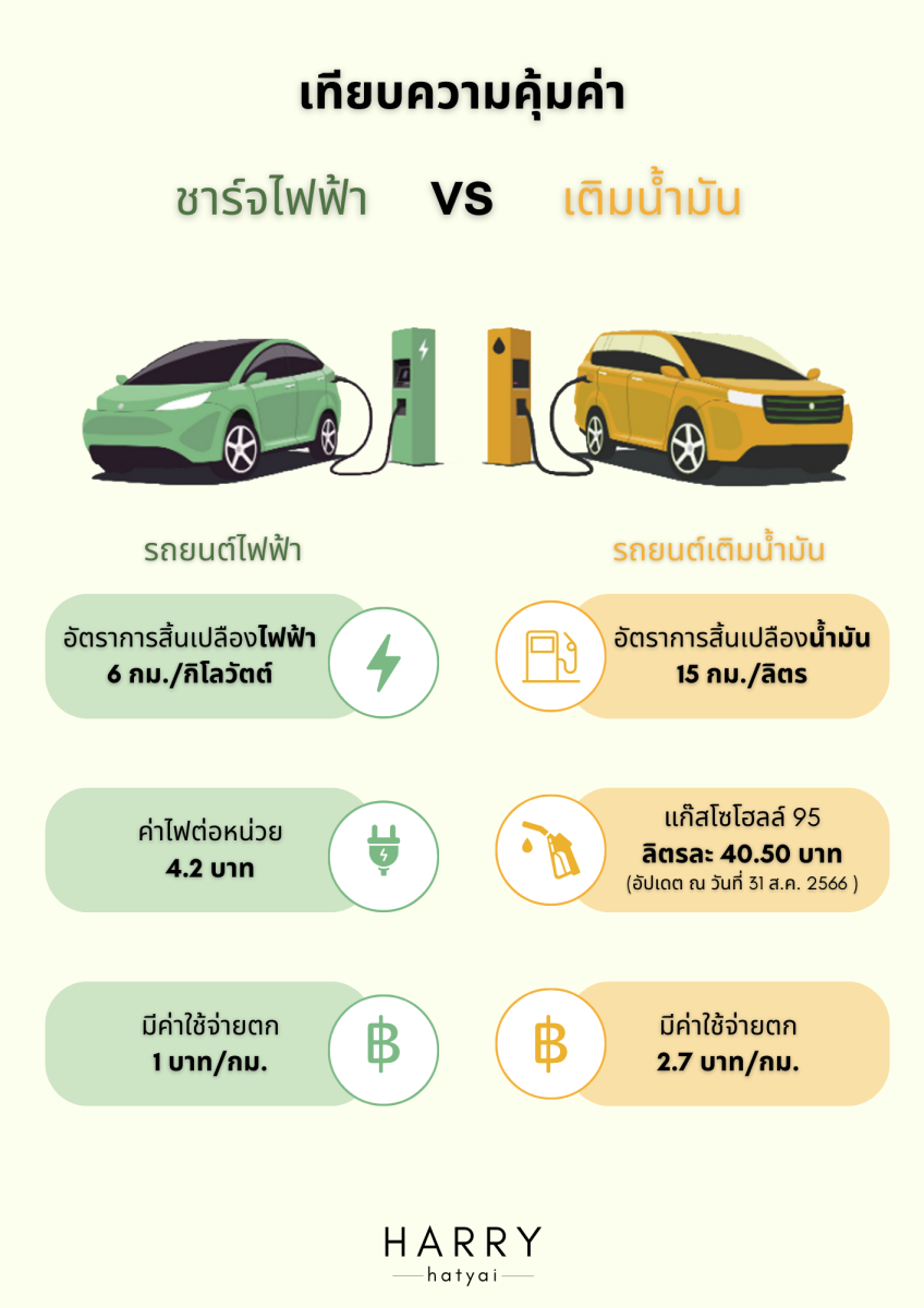 เริ่มต้นคำนวณจากรถยนต์ไฟฟ้า โดยปกติจะมีอัตราการสิ้นเปลืองพลังงานไฟฟ้า 6 กิโลเมตรต่อกิโลวัตต์ (kWh) ถ้าราคาค่าไฟต่อหน่วย (kWh) อยู่ที่ 4.2 บาท การขับรถยนต์ไฟฟ้าจะมีค่าใช้จ่ายประมาณ 1 บาท/กิโลเมตร